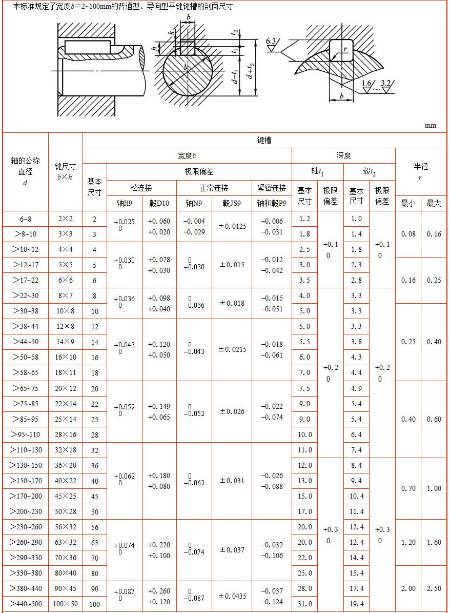 平键键槽的尺寸与公差(GB/T 1095—2003)注:1.导向平键的轴槽与轮毂槽用较松键连接的公差。2.除轴伸外,在保证传递所需转矩条件下,允许采用较小截面的...