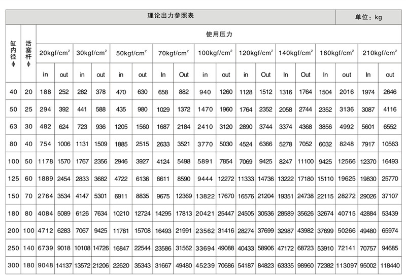 理论出力参照表: 1)in表示油缸受拉力时的受力,out表示油缸受推力时的受力; 2)10kgf/cm2=1Mpa;1000kg=1T; 3)缸内径和活塞杆直径的单位为毫米mm。